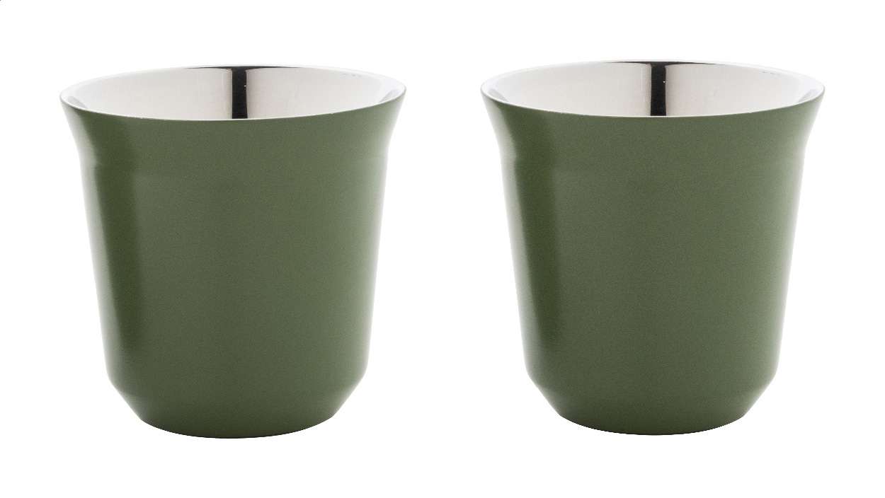 Komplekts – 2 gabali espresso glāzes kafijas kapsulas formā. Tās ir no pārstrādāta, nerūsējošā tērauda un uzglabā dzēriena temperatūru. Tilpums: 80 ml.