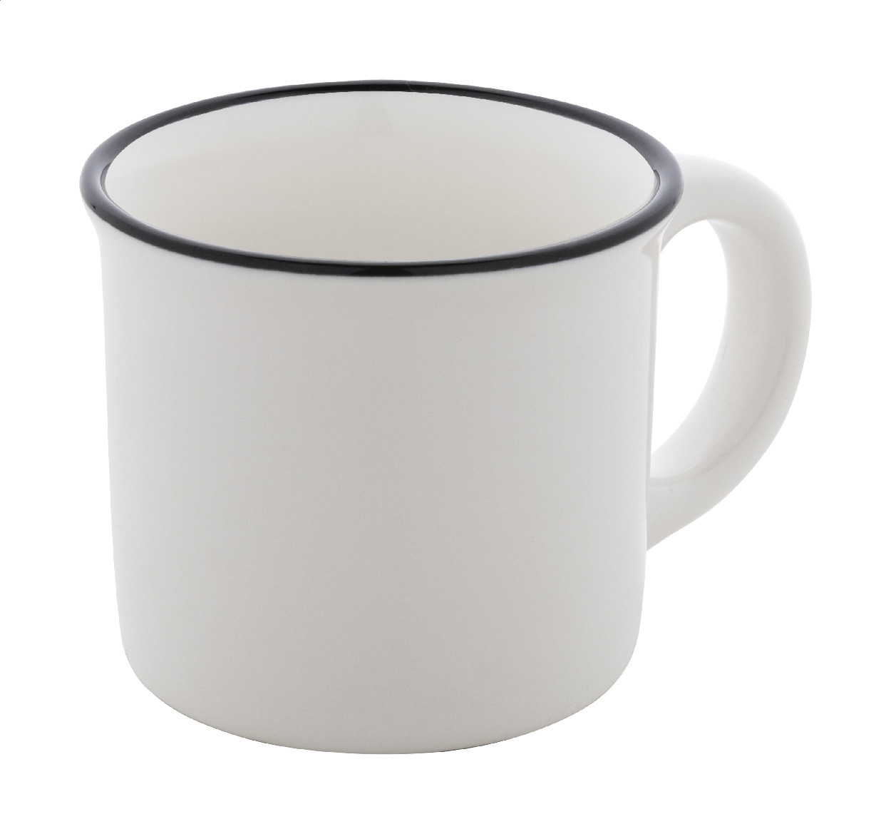 Mazā ”vintage” stila keramikas krūze ar melnu apmali, baltu iekšpusi un krāsainu ārpusi, tilpums 90 ml.