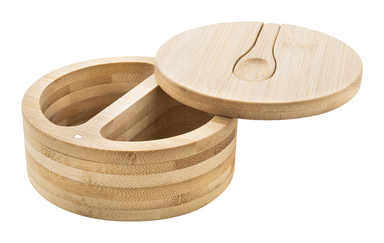 Bambusa sāls un piparu trauks ar diviem nodalījumiem un magnētisku, grozāmu vāku. Aprīkots ar iebūvētu karotīti. Izmērs: ø115×50 mm.