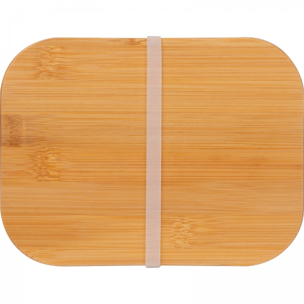 Borosilikāta stikla pusdienu kārba ar bambusa vāku un elastīgu silikona siksnu.
