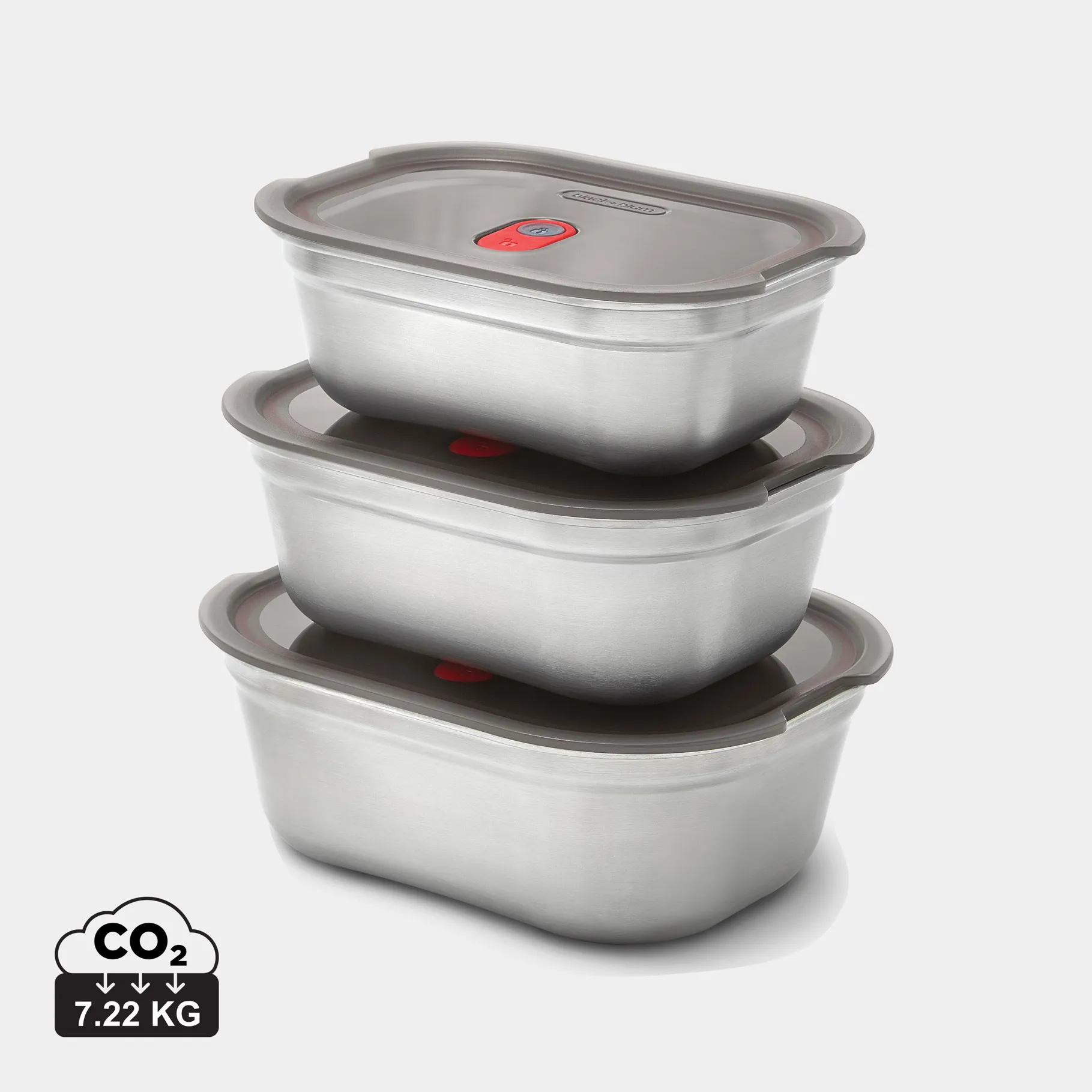 Šie pārtikas uzglabāšanas trauki ir izstrādāti tā, lai tie būtu maksimāli praktiski: puscaurspīdīgie vāki ļauj acumirklī pārredzēt saturu, savukārt inovatīvais vāka aizdares ventilis nodrošina iespēju sildīt ēdienu mikroviļņu krāsnī, nenoņemot vāku. Tas ievērojami paātrina sildīšanas procesu un pasargā krāsns iekšpusi no šļakatām. Augstākās kvalitātes nerūsējošā tērauda pamatne ir ne tikai droša lietošanai saldētavā un trauku mazgājamajā mašīnā, bet arī izmantojama cepeškrāsnī kā cepamtrauks (bez vāka). Komplekts ir veidots tā, lai tukšās kārbas varētu ievietot vienu otrā, maksimāli ietaupot vietu jūsu virtuves skapīšos.