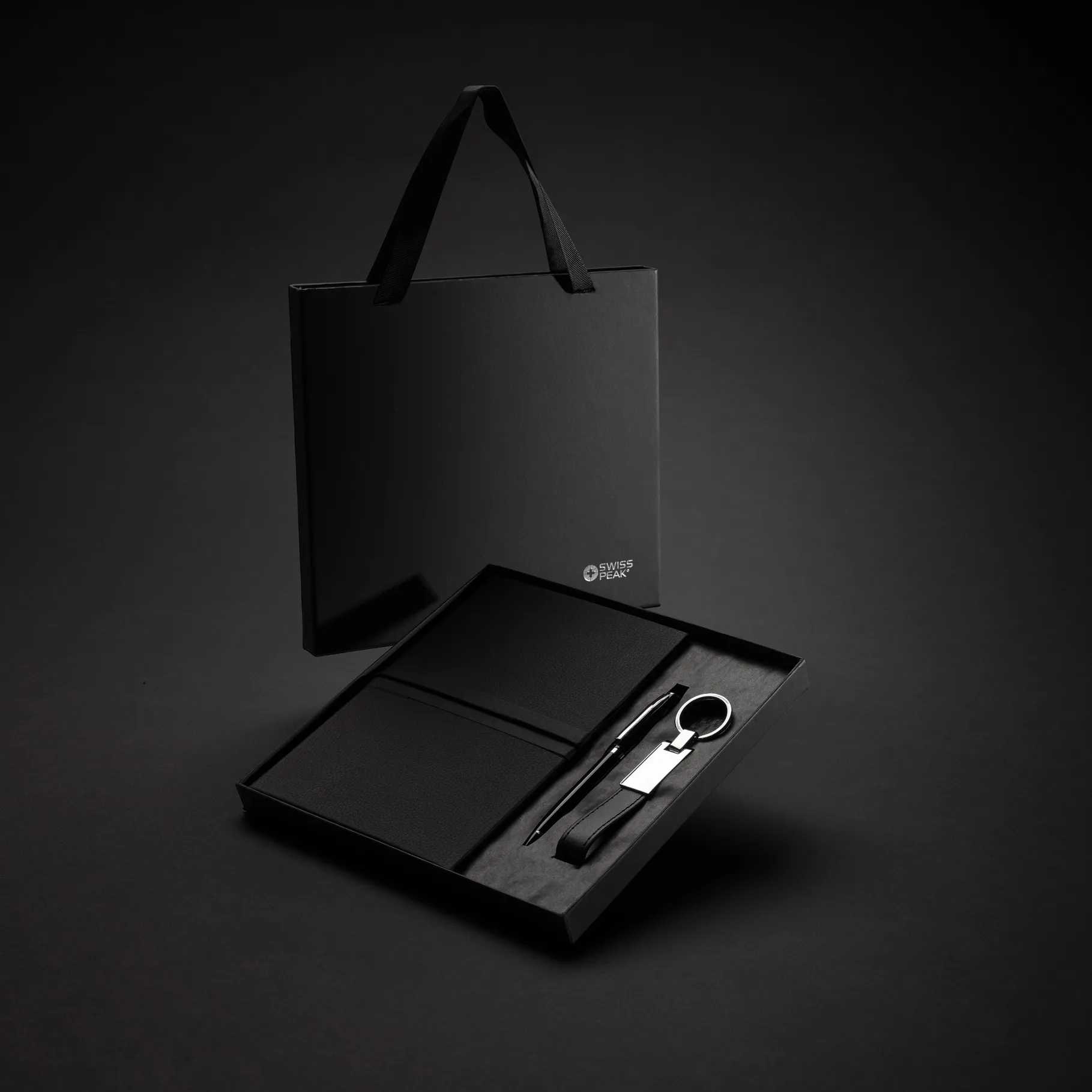 Swiss Peak RCS sertificētais biznesa dāvanu komplekts ir luksusa klases risinājums, kas apvieno ikdienas darbam nepieciešamākos aksesuārus ar augstākajiem ilgtspējas standartiem. Šis komplekts ir rūpīgi izstrādāts, lai sniegtu nevainojamu lietošanas pieredzi un pasvītrotu tā īpašnieka profesionālo tēlu. Eleganti melnais dizains un premium materiāli padara to par perfektu izvēli korporatīvajām dāvanām, kas paliks atmiņā un kalpos gadiem ilgi.