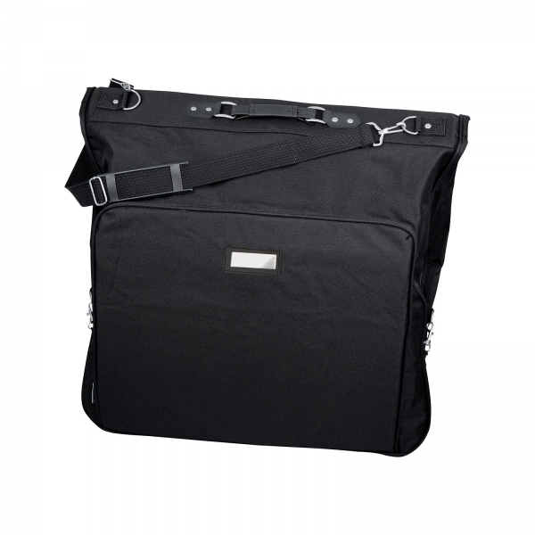 Liels un izturīgs poliestera uzvalka čehols ar plecu siksnām, rokturi, papildu nodalījumiem un smalku metāla plāksnīti uz etiķetes no mākslīgās ādas.