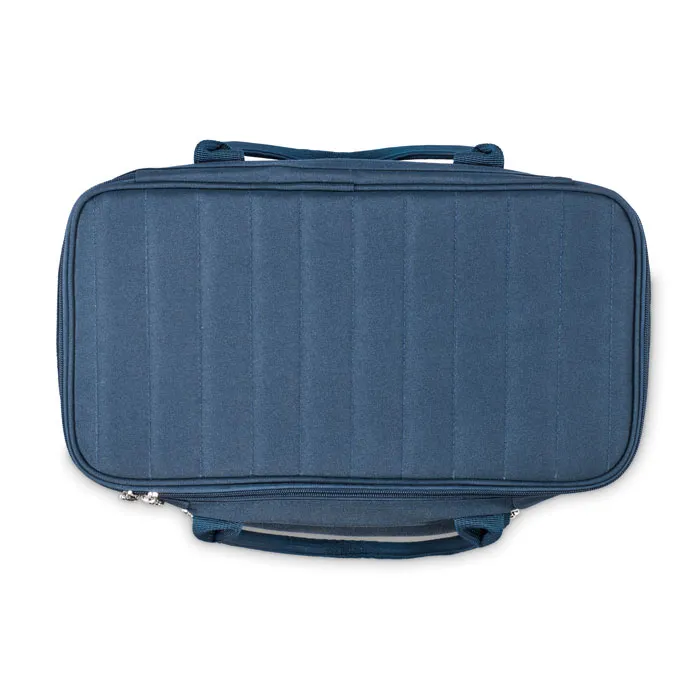 Ar dāsno 18 litru ietilpību, galvenais nodalījums nodrošina pietiekami daudz vietas dzērienu un uzkodu uzglabāšanai vēsumā, savukārt somas priekšpusē izvietotā kabata ar rāvējslēdzēju slēpj pilnu servēšanas komplektu divām personām. Jums vairs nav jāuztraucas par trauku komplektēšanu – viss nepieciešamais ir glīti sakārtots un gatavs lietošanai. Somas tumši zilais tonis (PMS 654C) un klasiskais dizains padara to par gaumīgu aksesuāru gan pludmalē, gan parkā vai pārgājienā.