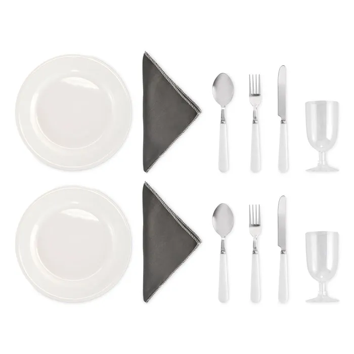 Piederumi: 2 nerūsējošā tērauda galda piederumu komplekti, 2 PS plastmasas šķīvji, 2 PS plastmasas glāzes un 2 kokvilnas salvetes.