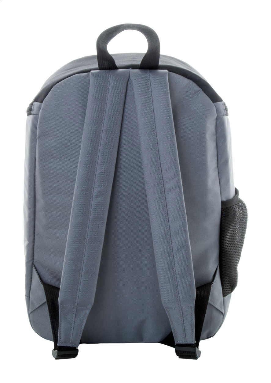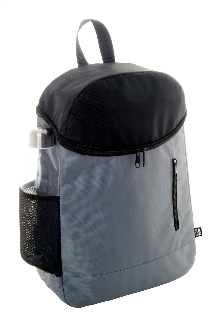 RPET aukstum-mugursoma ar alumīnija izolāciju, sānu tīkliem, galveno nodalījumu un priekšējo kabatu ar rāvējslēdzēju. Izgatavota no 600D RPET poliestera. Izmērs: 280×400×120 mm.