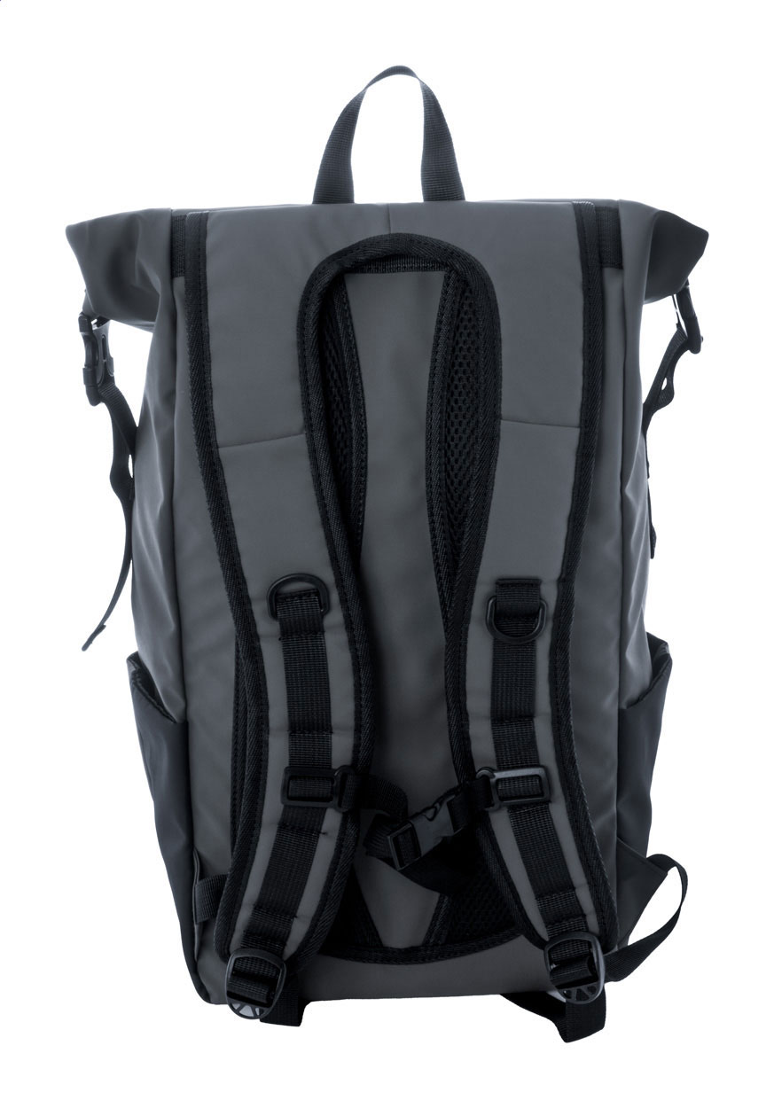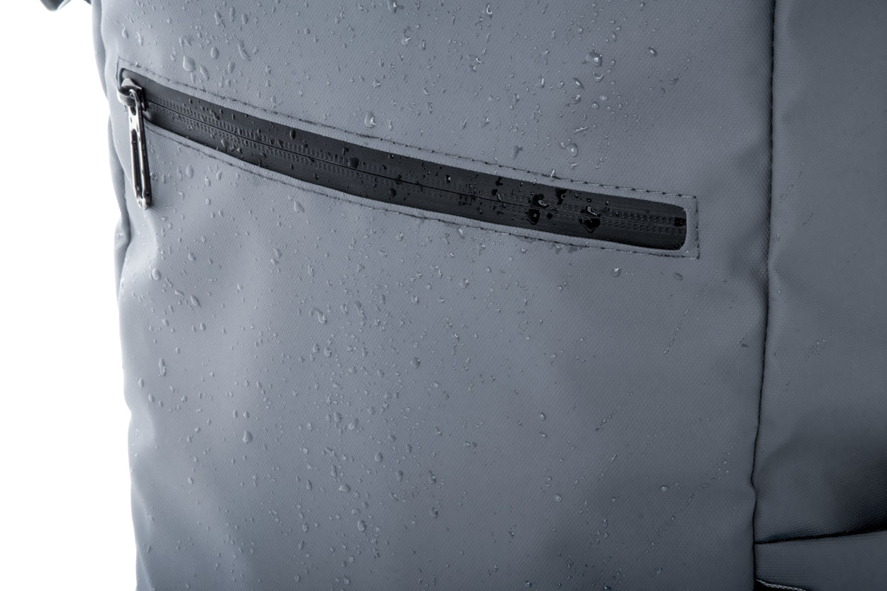 Ūdensnecaurlaidīga, RPET ”rolltop” mugursoma ar sprādzes un velcro aizdari. Aprīkota ar polsterētu klēpjdatora nodalījumu līdz 16 collu izmēram, planšetes nodalījumu līdz 10 collu izmēram, priekšējo kabatu ar rāvējslēdzēju, sānu kabatām, kā arī polsterētu muguras daļu un plecu lencēm. Izgatavota no PU, pārklāta ar 600D RPET poliesteru. Izmērs: 260×500×180 mm.