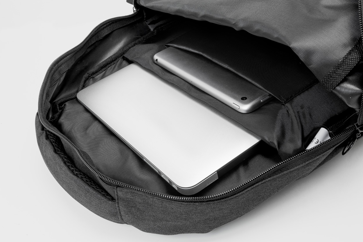 Mugursoma ar nodalījumiem ar rāvējslēdzēju, polsterētu klēpjdatora nodalījumu līdz 15″ collām un planšetes nodalījumu līdz 10″ collām. Muguras daļa un plecu lences ir polsterētas. Aprīkota ar iebūvētu USB savienojumu powerbankām. Izgatavota no 600D RPET poliestera. Izmērs: 310×450×170 mm.