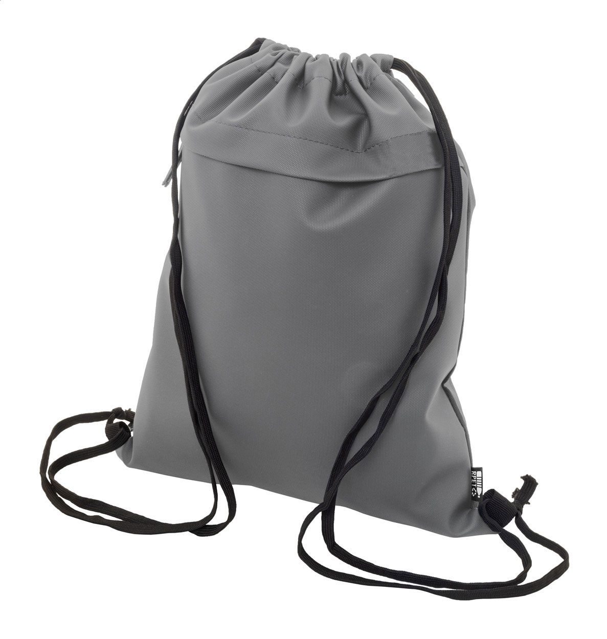 RPET maisiņš ar auklas aizdari, priekšējā puse pārklāta ar PU un priekšā ir kabata ar rāvējslēdzēju. Izgatavots no PU, pārklāta ar 600D RPET poliesteru. Izmērs: 330×400 mm.