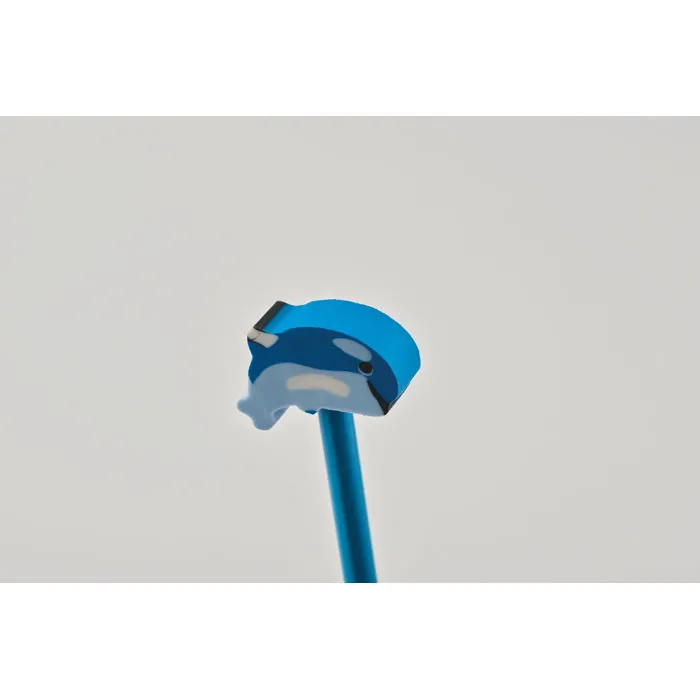 Dizains: Klasisks koka zīmulis ar krāsainu dzīvnieka formas dzēšgumiju galā.