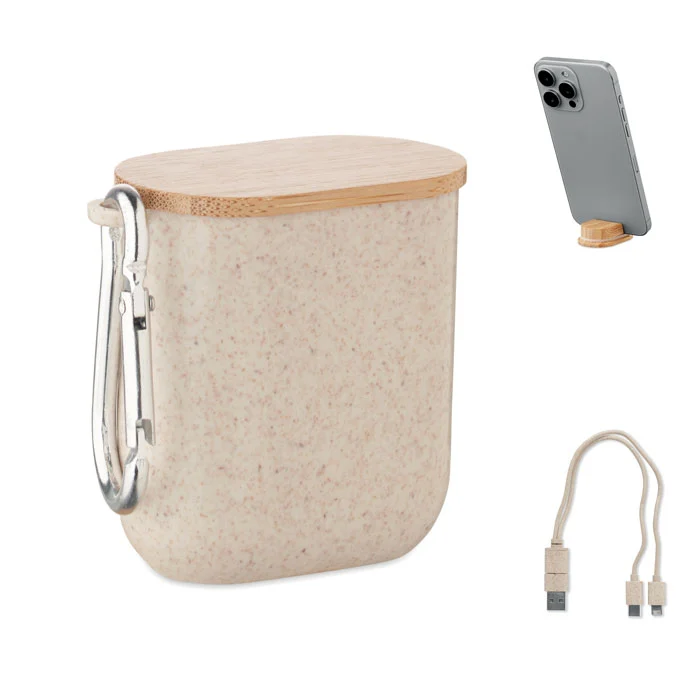 EKO tehnoloģiju aksesuārs CABSTRA izceļas ar universālu savienojamību, jo komplektā ietilpst kabeļu sistēma ar “divi vienā” USB-C un USB-A ieeju, kā arī Type-C un speciālo “2 in 1 pin” izeju, nodrošinot saderību ar plašu viedierīču klāstu. Šī ierīce ir aprīkota ar praktisku karabīni, kas ļauj to viegli piestiprināt pie mugursomas, jostas vai atslēgu piekariņa, padarot to par neaizstājamu biedru ceļojumos, pārgājienos vai dinamiskā darba vidē. Izmantotie materiāli, piemēram, kviešu salmi, samazina neapstrādātas plastmasas patēriņu, apliecinot atbildīgu pieeju resursu izmantošanai un mūsdienīgu izpratni par videi draudzīgiem aksesuāriem.