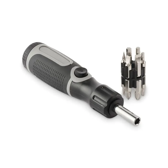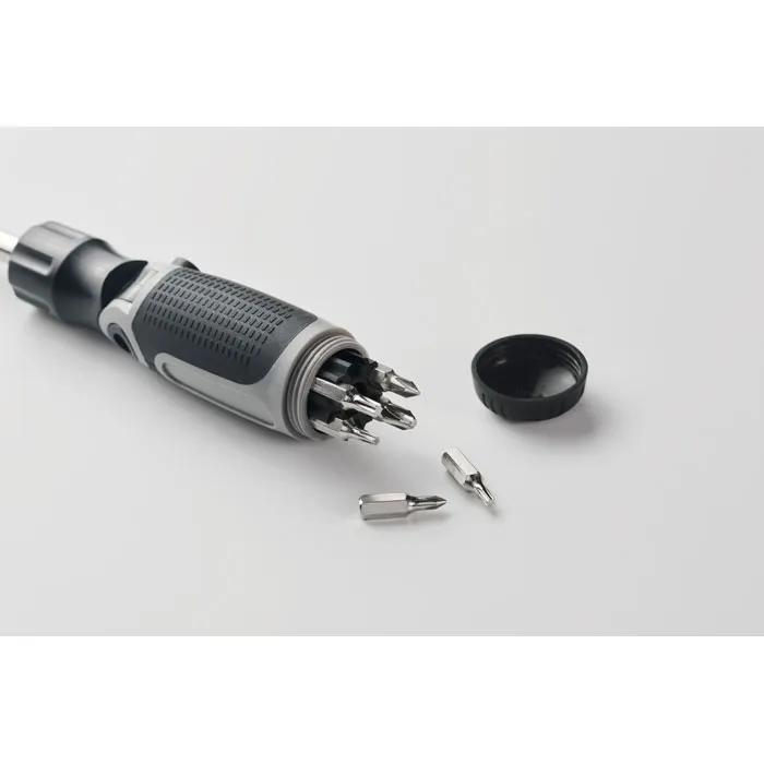 Komplekts ir aprīkots ar ergonomisku ABS plastmasas rokturi, kas nodrošina stingru tvērienu, un tajā ietilpst 12 dažādi dzelzs uzgaļi (biti), kas aptver visus populārākos skrūvju veidus: