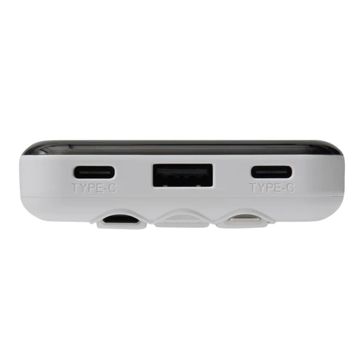 Papildus iebūvētajiem kabeļiem, šī powerbanka piedāvā arī plašas pieslēgvietu iespējas priekšpusē. Ierīcei ir divi USB Type-C porti, kas darbojas gan kā ieejas, gan izejas, un viena papildu USB Type-A izeja. Tas ļauj vienlaicīgi lādēt vairākas ierīces, daloties enerģijā ar draugiem vai nodrošinot barošanu visam savam viedierīču komplektam. Powerbanka POWERSTOCK ir aprīkota ar ērtu ieslēgšanas un izslēgšanas slēdzi, kas palīdz taupīt enerģiju, kad ierīce netiek izmantota. Baltas krāsas korpuss, kas izgatavots no kvalitatīvas un izturīgas plastmasas, piešķir ierīcei modernu un tīru vizuālo tēlu.