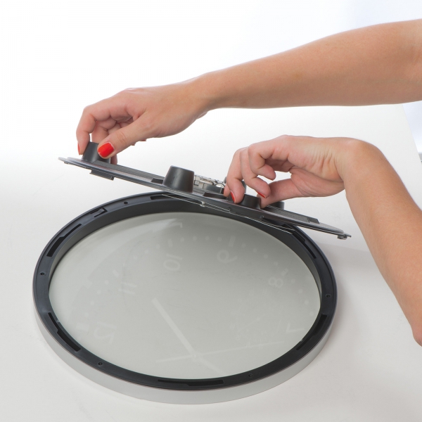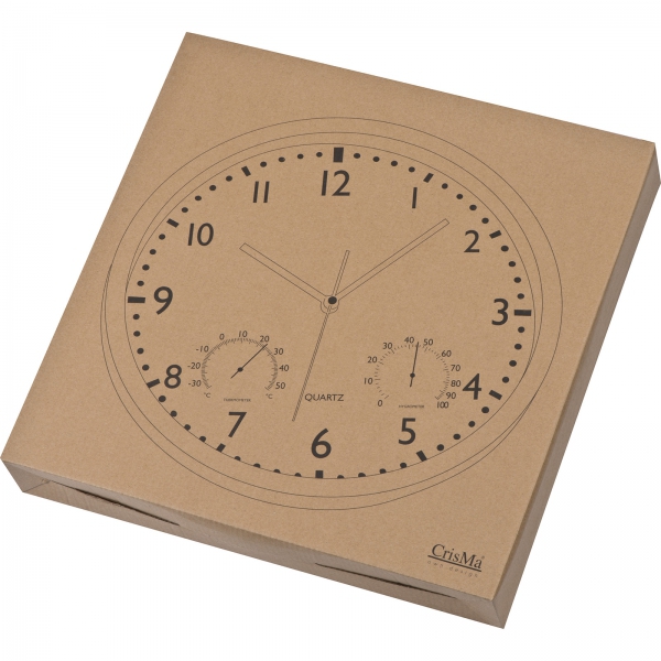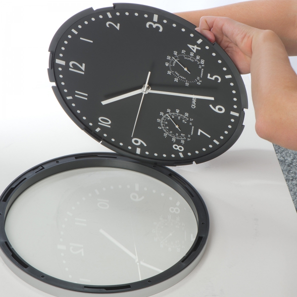 Klasisks sienas pulkstenis ar higroskopu un termometru. Ar bajonetes aizdares palīdzību displeju var viegli izņemt no korpusa.