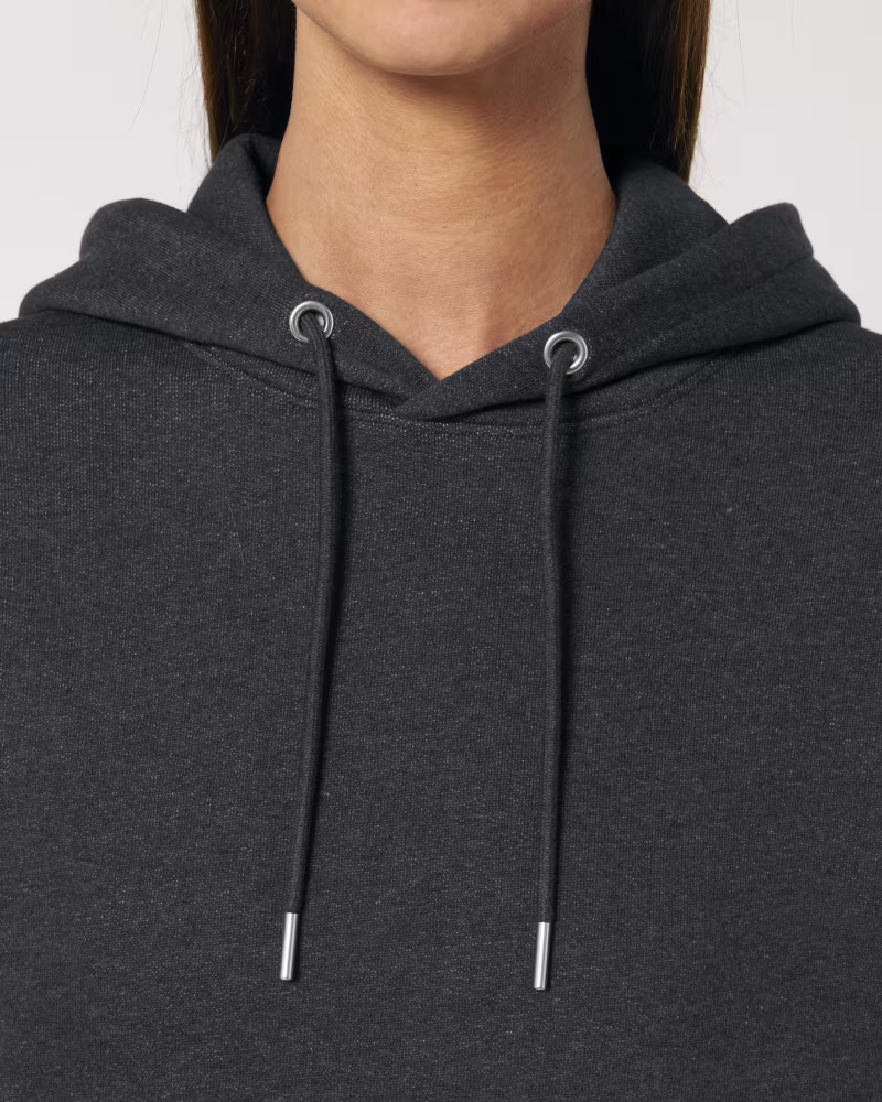 Ekskluzīva apdare: Dubultslāņa kapuce no pamatmateriāla, apaļas auklas džempera krāsā ar noslēgtiem metāla uzgaļiem un metāla atverēm (eyelets) piešķir izstrādājumam premium klases vizuālo tēlu.